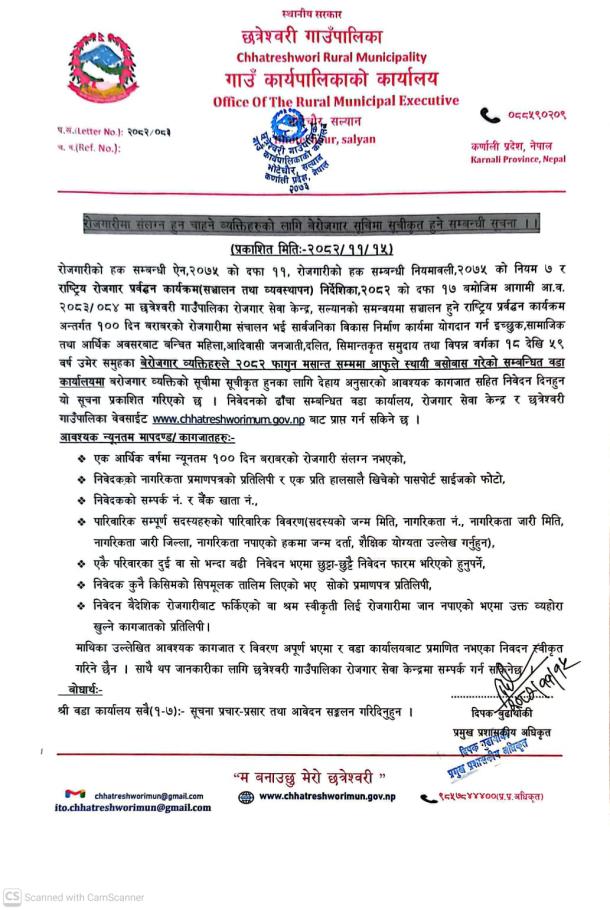 रोजगारीमा संलग्न हुन चाहने व्यक्तिहरुको लागि बेरोजगार सुचिमा सुचिकृत हुने सम्बन्धी सुचना ।।