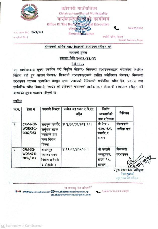 बोलपत्रको आर्थिक पक्ष / सिलवन्दी दरभाउपत्र स्वीकृत गर्ने आशयको सूचना ।।